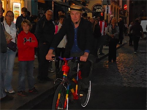People having fun looking out of pub windows,electric trams an iconic river Liffey and its lovely array of bridges and a bloke wearing a Banana Skin with what looks like a giant Willy Holder at its base ! Your thoughts?