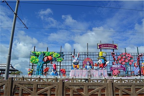We have a hire car and the weather today is fine so me n Annie took a drive along the Famous Golden Mile of Blackpool,Tourists horse and carts were doind a brisk business going up and down the Prom (the olde type of landau I knew as a child are disappearing and “Cinderella”type carriages are now in vogue) Trams are around,some brand new others from yesterday add to the prom attractions (the Tower will be given a blog of its on later )Driving the prom can be quite hazardous but on this day the going was good..After a while we ended up in Prom suburb where parking is ok an ventured out for a walk,the tide was just coming in and we are on the Irish Sea Coast North West England,On he distant horizon could be see a huge numbers of Power Windmills and they look awesome.This coming weekend see,s the lighting up of the World Famous Illuminations & the Tableaus displayed are looking great